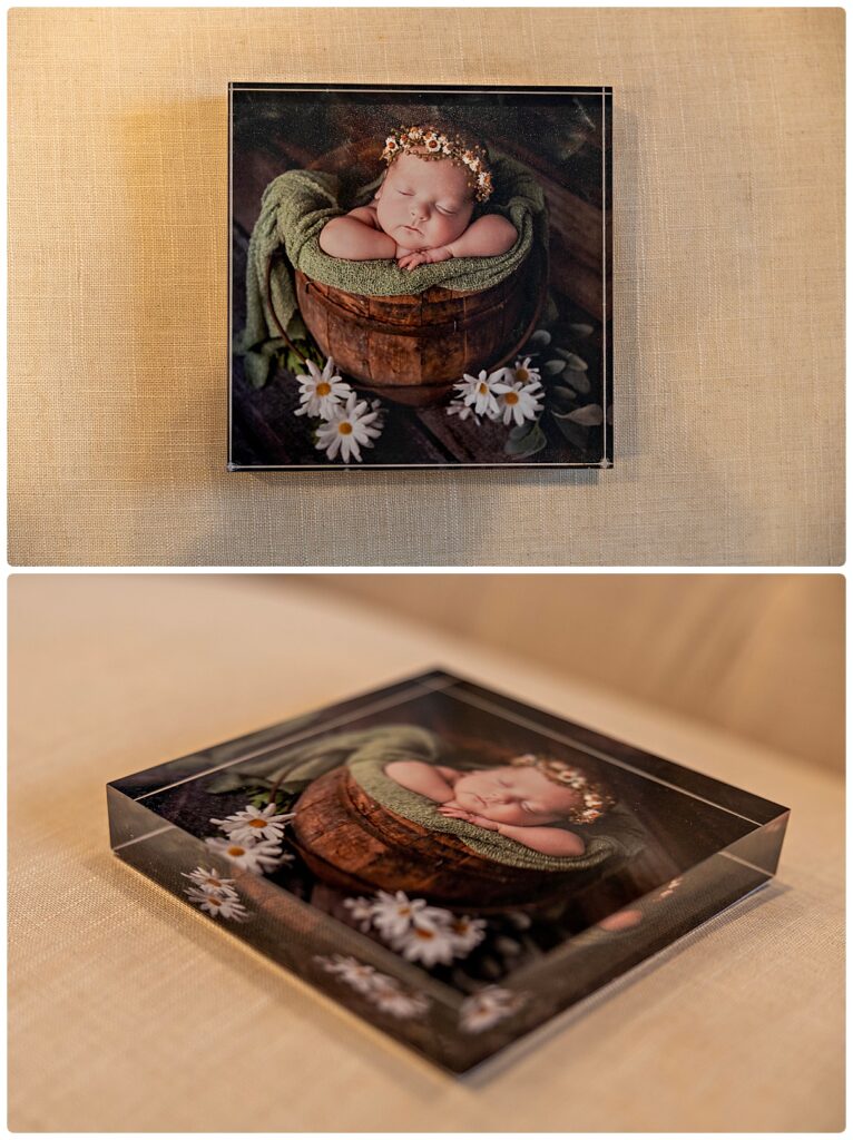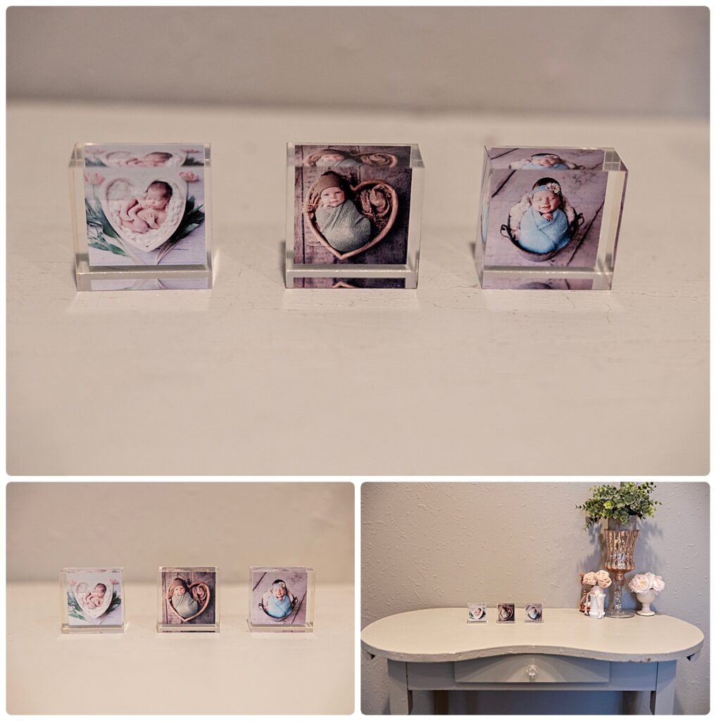 Our acrylic blocks are simple and great for desks, mantles, and shelves. We offer them in a 5×7, 6×6, 8×10, or circle. We also offer mini acrylic blocks that come in a set of 3 and they are 2×2.